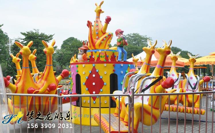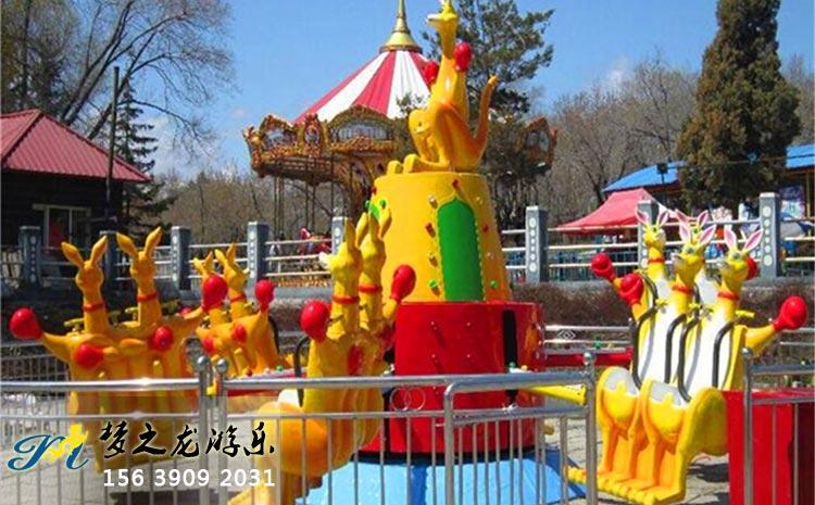 游乐设备袋鼠跳是通过澳洲袋鼠的形象及运动形式设计的,它造型生动形象,设备启动时,袋鼠上下跳动,围绕中心旋转,游客就仿佛乘坐袋鼠在奔跑在辽阔的草原一样,既能体验刺激又能开阔视野,十分有趣。